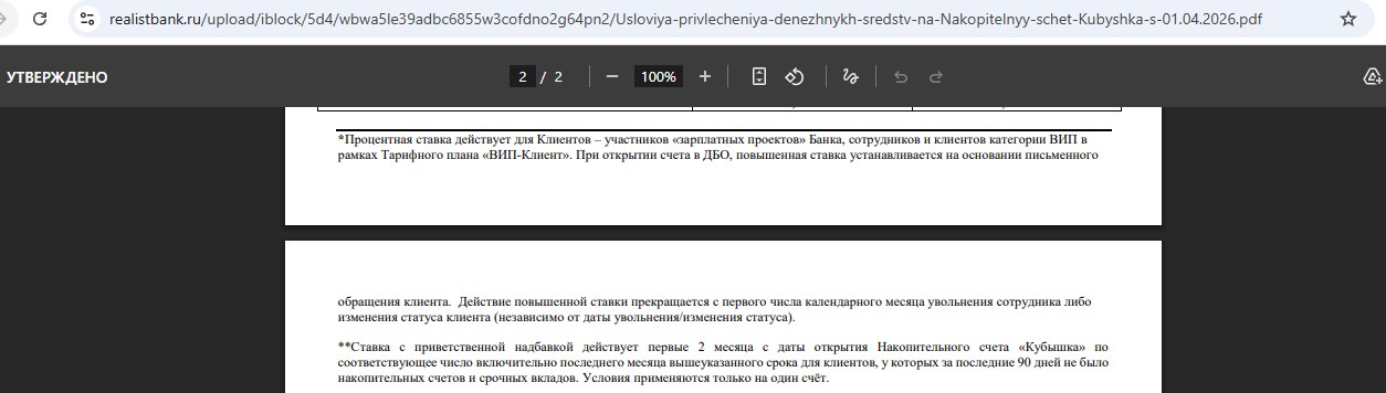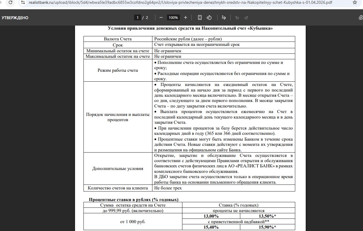 • “Кубышка” от банка “Реалист” — 15,4% годовых (с 11.03) на ежедневный остаток от 1000 руб. новичкам в первые 2 месяца.