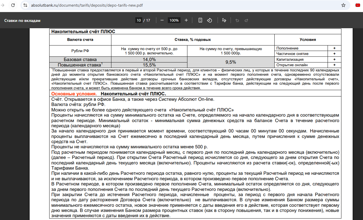 • “Накопительный счет Плюс” от “Абсолют Банка” — 15,5% годовых (с 10.11) на ежедневный остаток от 500 до 1 500 000 руб. новичкам в первые два месяца (потом, и для всех остальных сразу — 14% годовых).