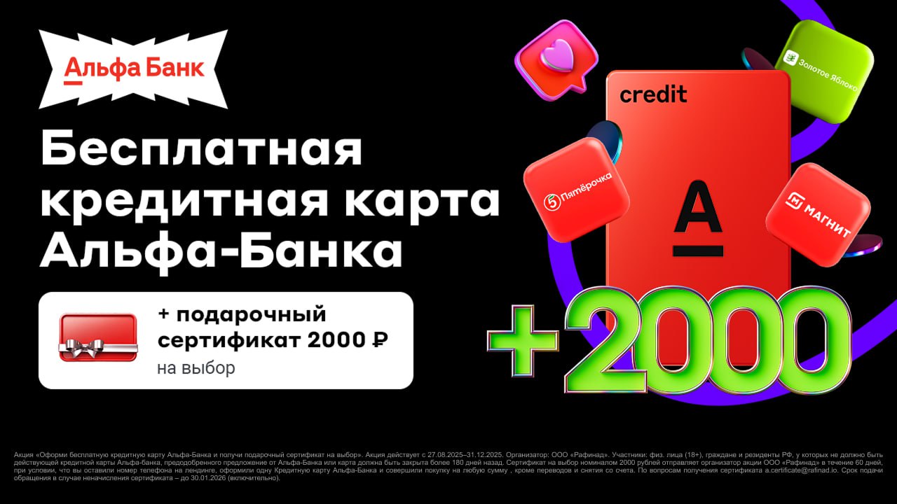 Если заказать кредитную карту "60 дней без%" от "Альфа-Банка" по этой ссылке до 31.12.25 и сделать минимум 1 покупку, то в подарок будет положен сертификат на 2000 руб. на выбор в Золотое Яблоко/Пятёрочку/Магнит.