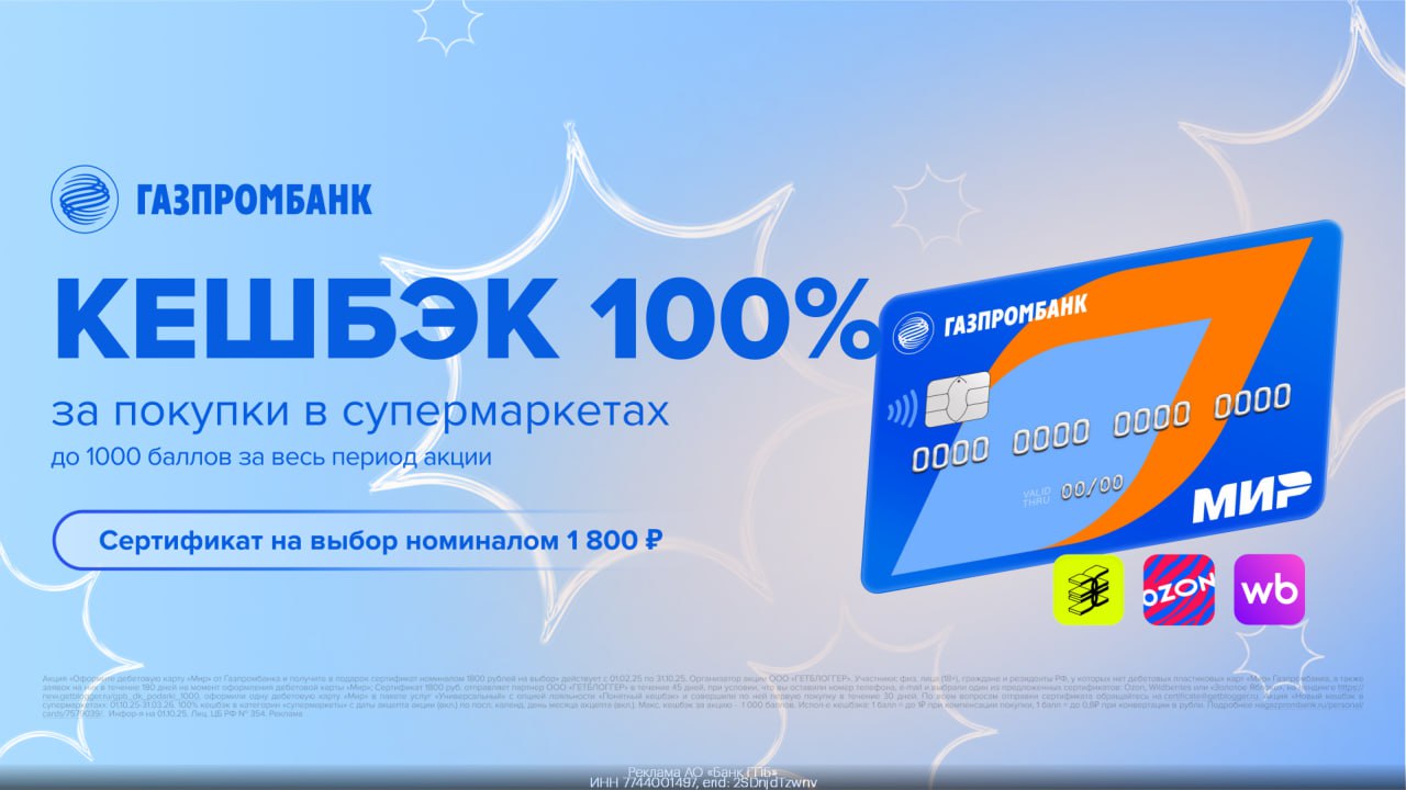 ▶️ Получить сертификат на 1800 руб. за бесплатную карту Газпромбанка с кэшбэком 100% в супермаркетах