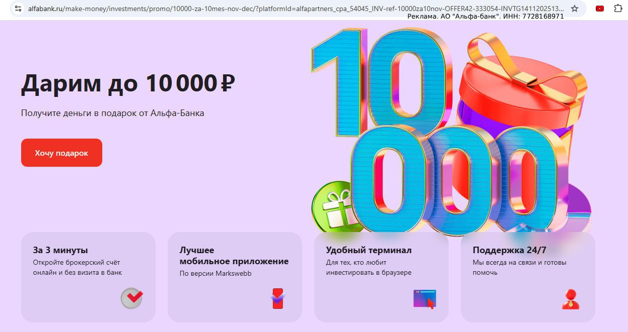 10 000 руб. за брокерский счёт в "Альфа-Банке". Акцию продлили до 07.12.25 включительно.