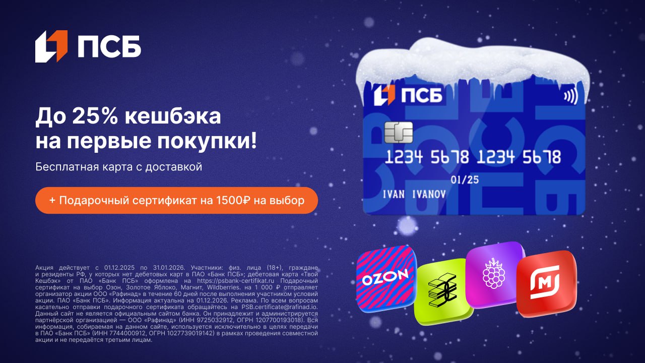 Если заказать бесплатную дебетовую карту "Твой кэшбэк" от "ПСБ" по этой ссылке и в первые 90 дней потратить от 1000 руб. (кроме списка исключений), то в подарок будет положен сертификат на выбор в OZON/WB/Магнит/Золотое Яблоко на 1500 руб.